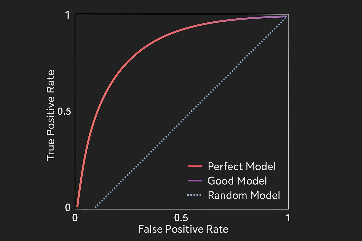 左上角 (0, 1) 代表一個完美的模型:FPR = 0 (沒有誤報),且 TPR = 1 (全部抓到)