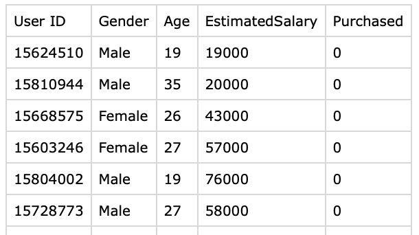 以下的 demo 是模擬如果我們透過對消費者的特性分析(年齡, 薪資)來預測消費者是否會真的購買商品. 此 demo 難度: 初階. 學習者可以嘗試用不同的模擬資料去訓練 AI 來做不同的目的.